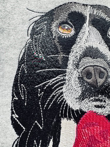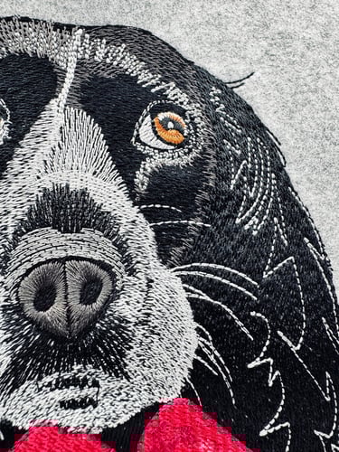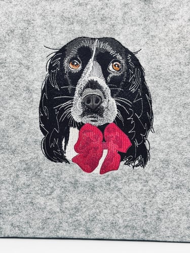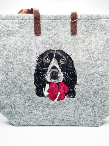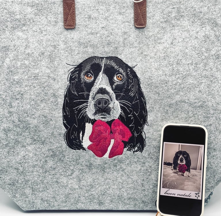 Questa bag in feltro è stata realizzata dopo un lungo processo di progettazione. La punciatura (il trasformare una foto/immagine in ricamo) viene eseguita manualmente ed in questa occasione è stata molto dettagliata, per restituire l'epressività del nostro amico a 4 zampe. Successivamente sono stati eseguiti diversi test per supervisionare se tutto funzionasse a dovere. Conclusa questa fase preliminare si passa finalmente alla produzione finale del prodotto.