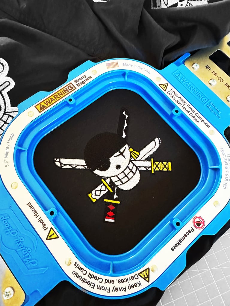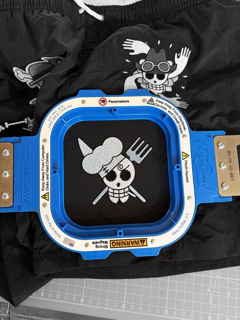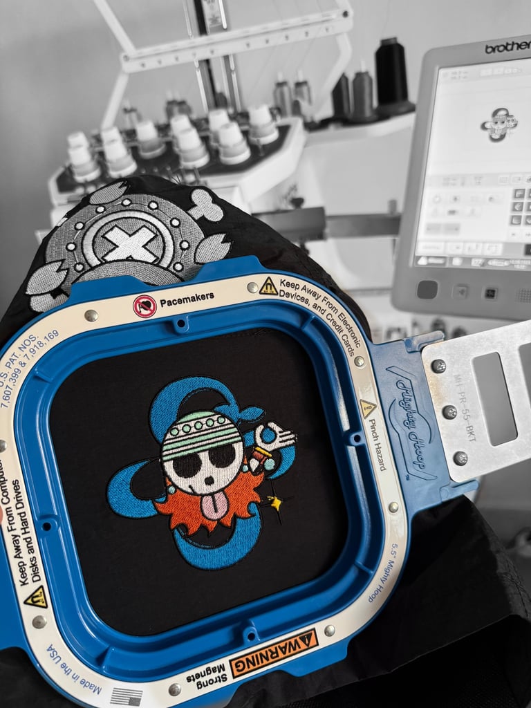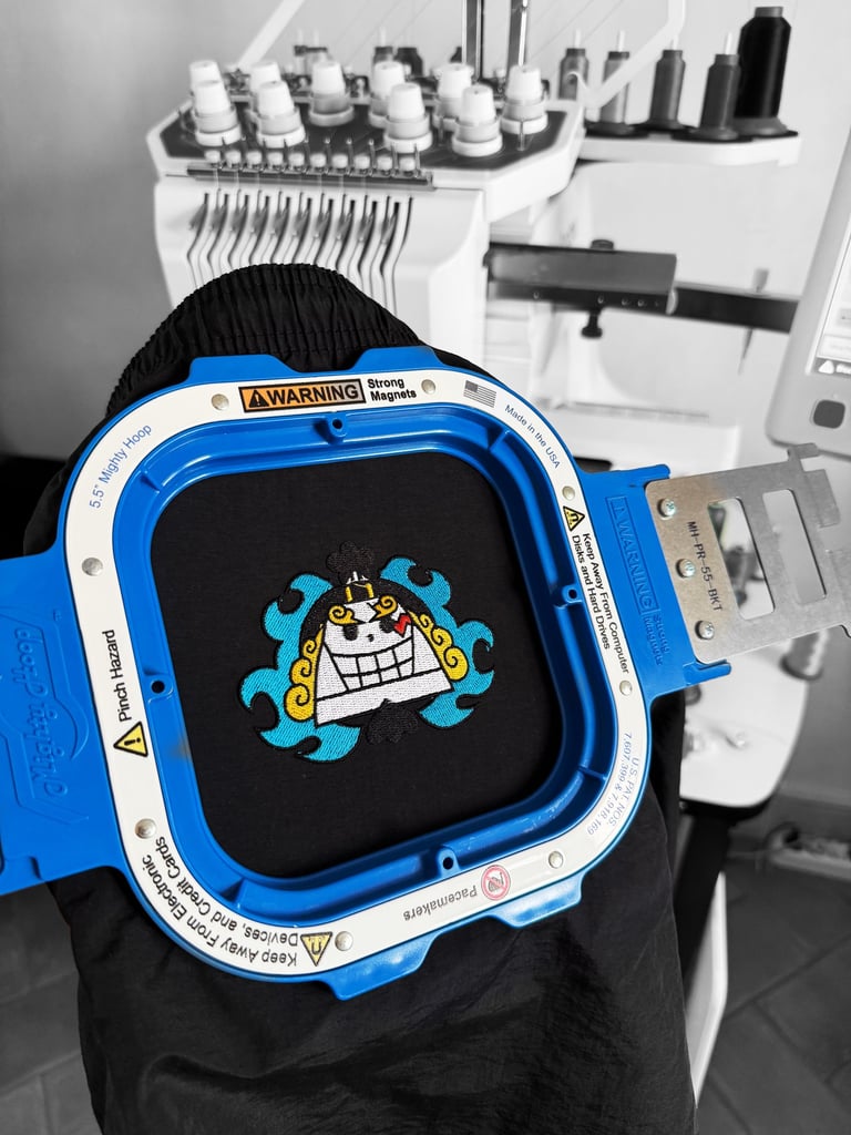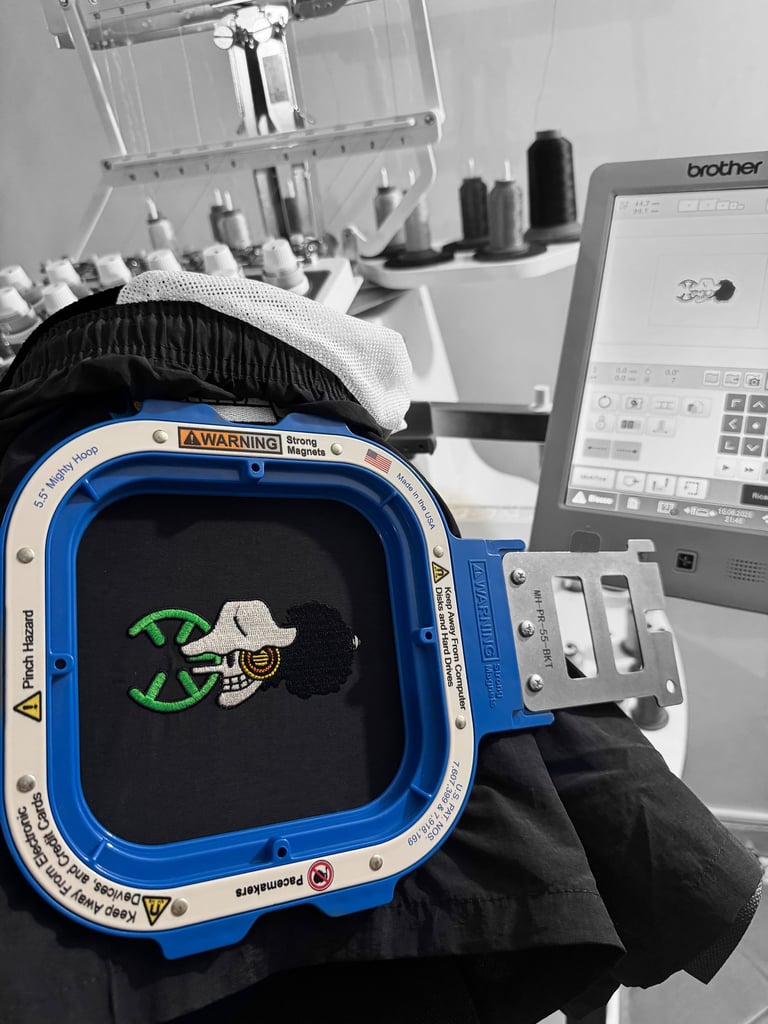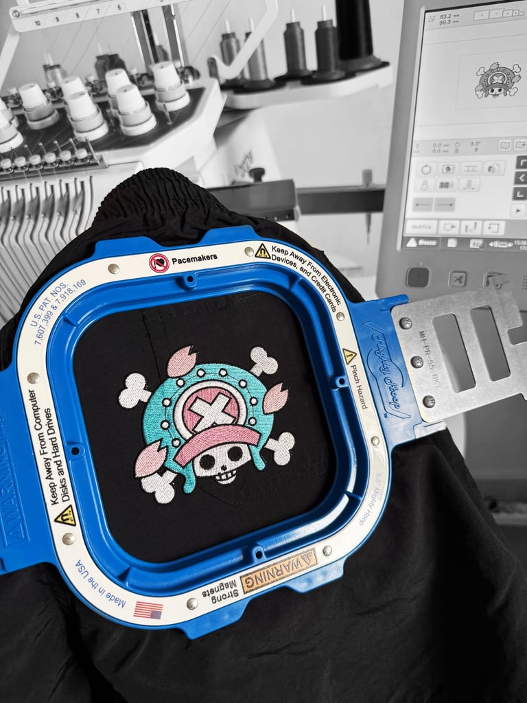 The framing is the stage in which the fabric is secured and inserted into the embroidery machine. In these shots, you can see the final stage of the embroidery process.