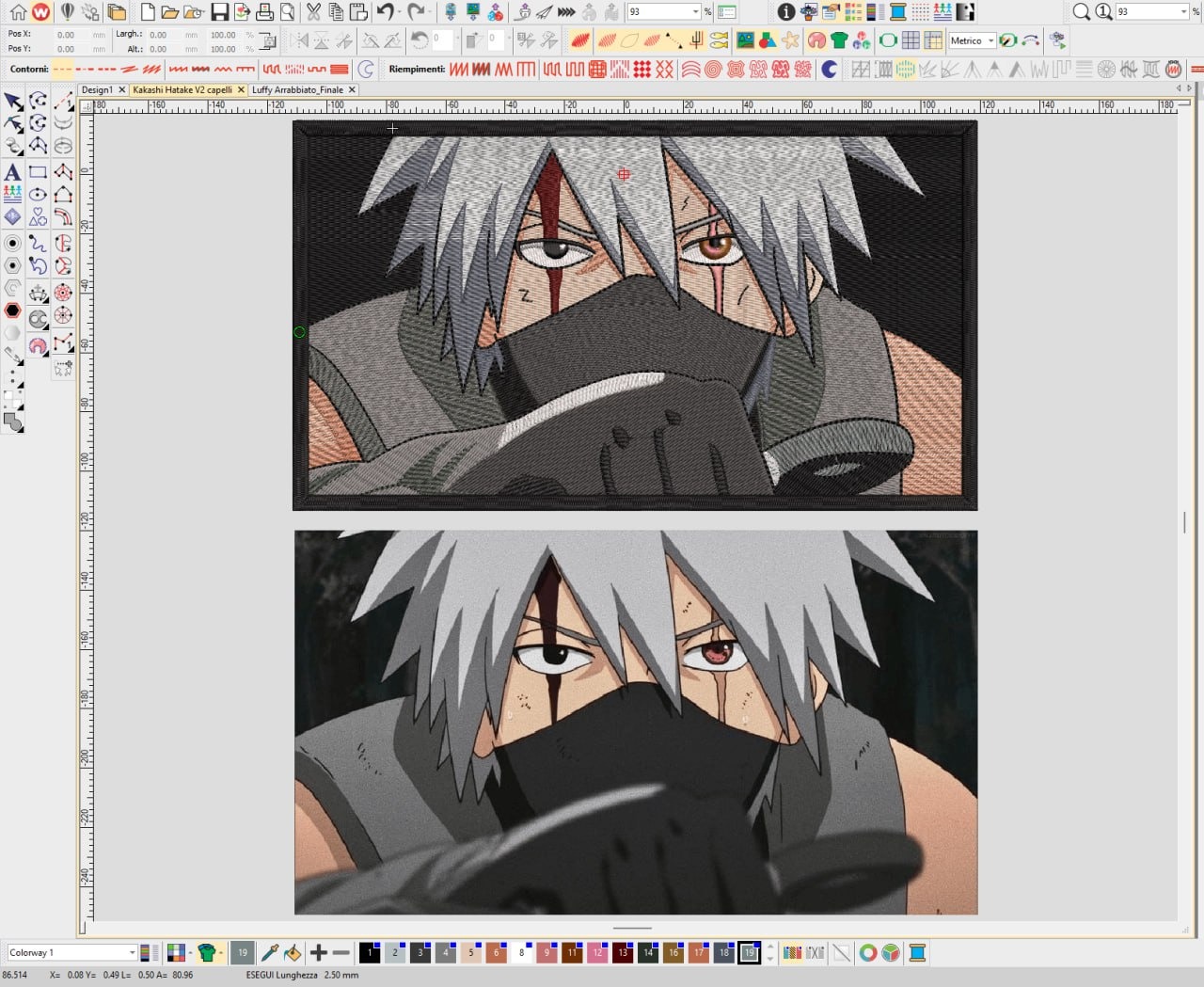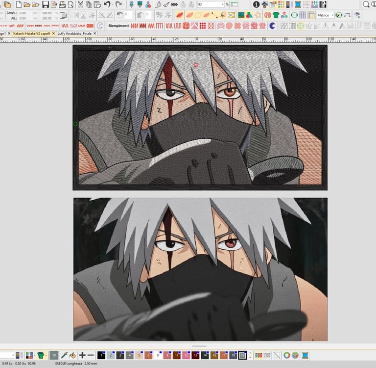 Il primo step consiste nella progettazione dell’immagine scelta. L'immagine viene poi punciata, ovvero convertita in un formato che possa essere interpretato dalla ricamatrice. Questa fase è cruciale, poiché determina la qualità e la durabilità del prodotto finale.